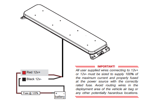 Step 1: Install a fuse customer supplied fuse rated for 125% of the circuit load to the end of the red, 12 AWG wire of the wire harness assembly. Do not use a circuit breaker or fusible link. Do not insert the fuse until the opposite end of the fuse holder is connected to the vehicle battery.